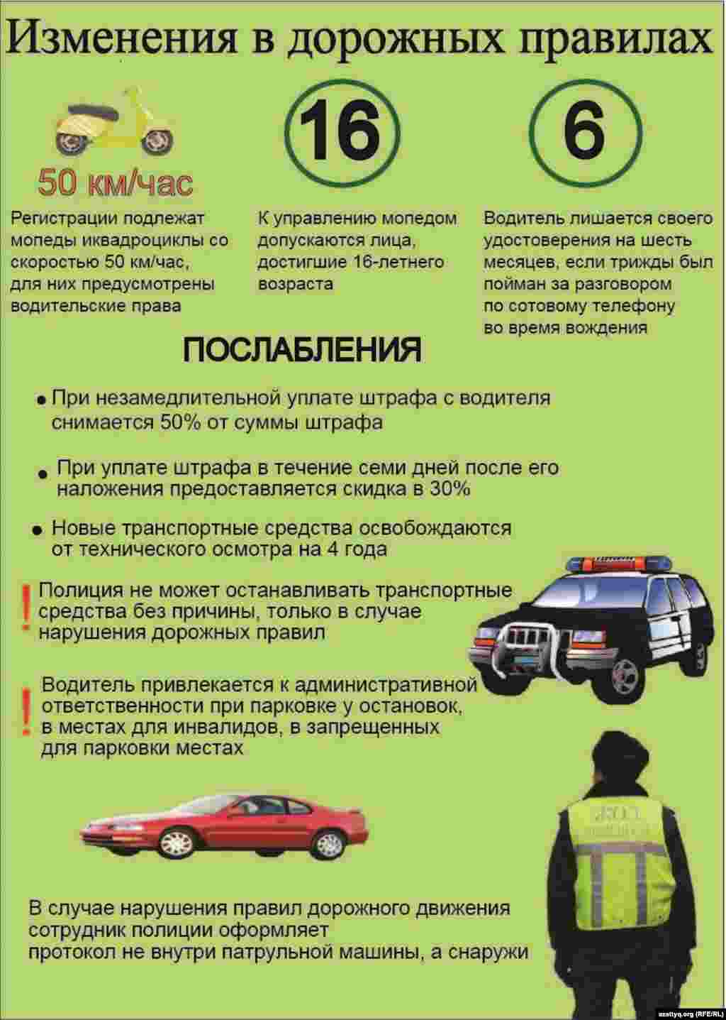 Парламент Казахстана внес изменения и дополнения в "Правила дорожного движения" и направил законопроект на подпись президенту страны. Основные изменения отображены в инфографике.
