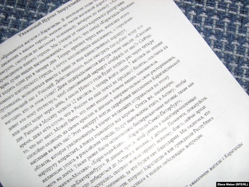 Вот выдержка из письма: «В настоящее время на нашем предприятии сложилась очень тяжелая обстановка. Во-первых, чуть ранее был отменен беспересадочный прицепной вагон Жезказган – Москва, не так давно были отменены прицепные вагоны сообщением из Караганды в Киев, Санкт-Петербург, Екатеринбург, которые были востребованы населением нашей области. Руководство компании «Казахстан темир жолы» на наши запросы отвечает, что эти маршруты являются социально-незначимыми, убыточными. Но это ложная информация».Корреспондент нашего радио Азаттык поговорил с сотрудниками карагандинского филиала по пассажирским перевозкам «Северный». Называть свои фамилии они не решились. По их словам, недавно им пришла факсограмма, где указано, что после нового года поезд сообщением Караганда – Москва будет курсировать один раз в четыре дня, поскольку якобы маршрут стал нерентабельным.