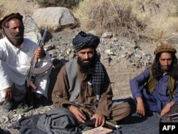 Представитель пакистанских талибов Азам Тарик (в центре) встречается с пакистанскими журналистами в неизвестном месте в Южном Вазиристане. 18 ноября 2009 года.