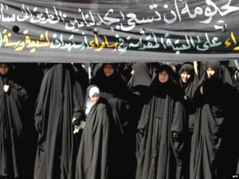 Иракские женщины-шиитки стоят под баннером, призывающем к безопасности на дорогах. Эн-Наджаф, 21 июня 2007 года.
